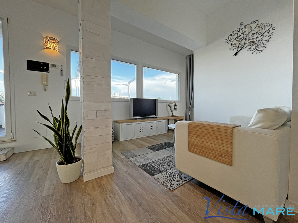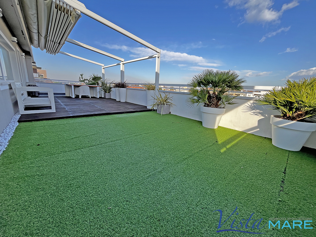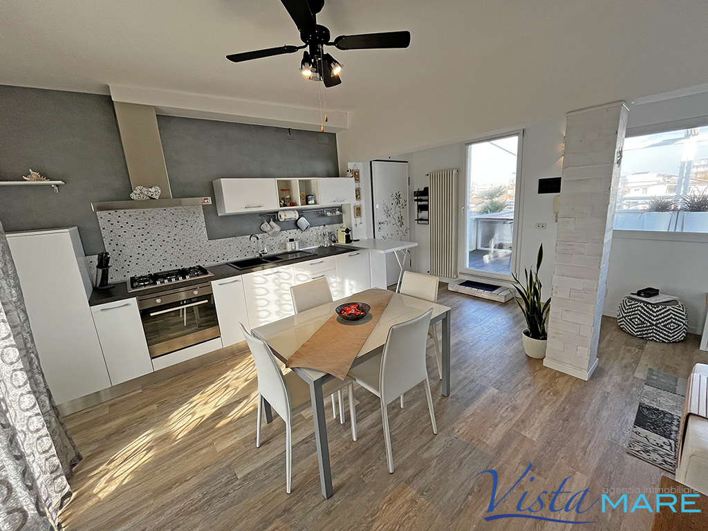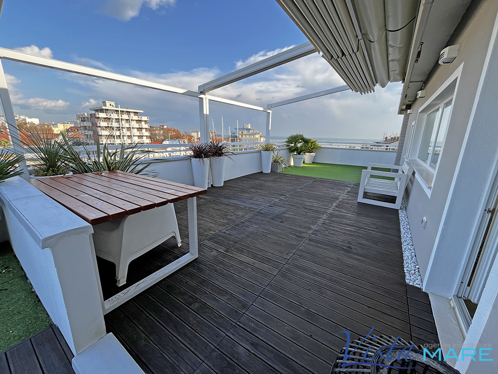 IGEA MARINA - BELLARIA IGEA MARINA - Con esclusiva vista panoramica, attico frontemare con un invidiabile terrazzo di oltre 70 mq. Unico nel suo genere, l'appartamento fa parte di un contesto di poche unità dotato di ascensore. L'immobile è oggetto di recente ristrutturazione e si presenta con ingresso in un open space in cui è presente la zona living con il reparto cottura a vista, ampie vetrate che donano un'invidiabile luminosità e l'accesso al terrazzo attrezzato con copertura elettrica, oltre alle varie zone relax per poter godere di ogni conforts. Completano l'immobile due camere da letto ed il bagno. Posto auto interno ed ampia cantina ciclabile posta al piano terra.