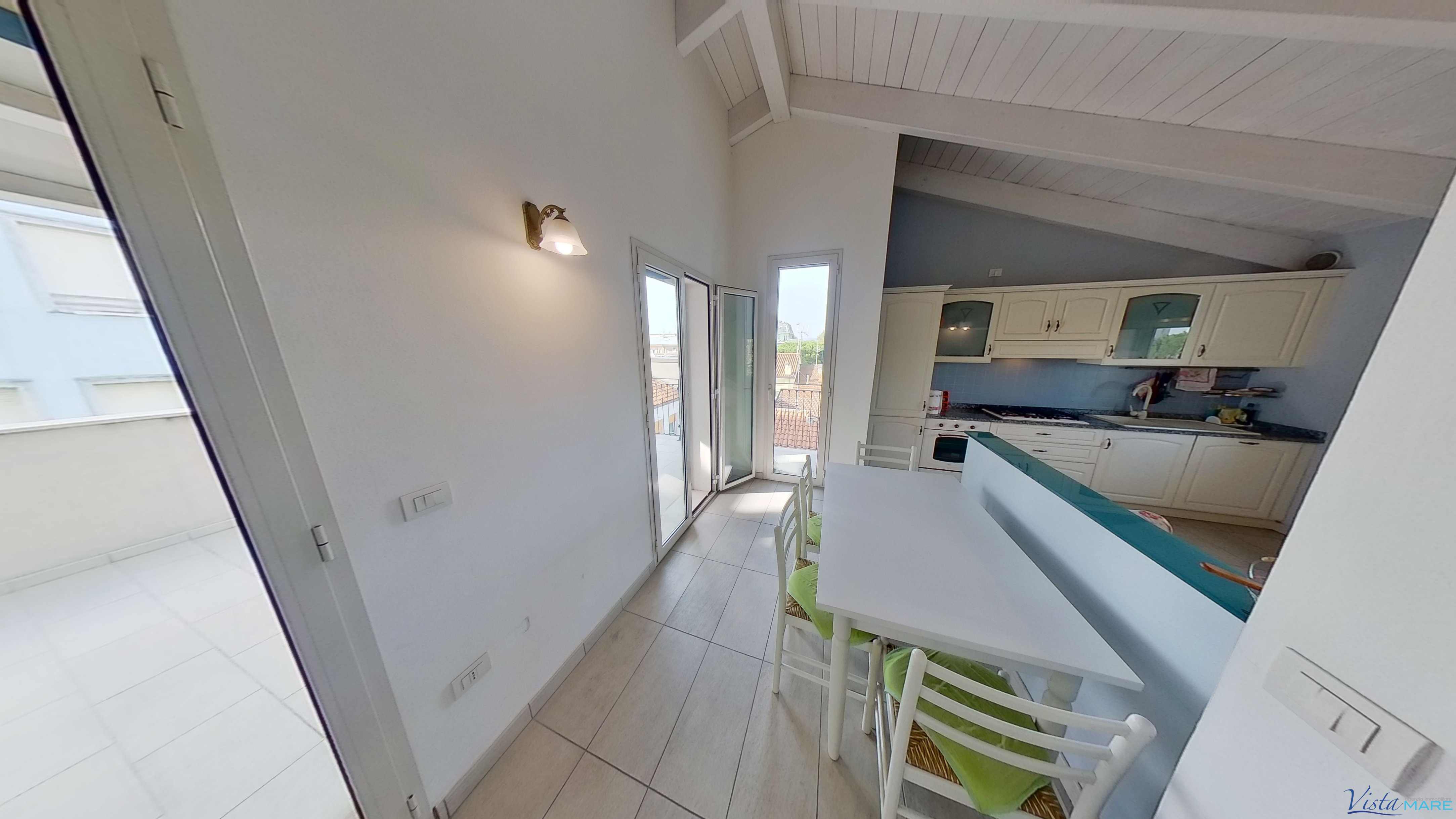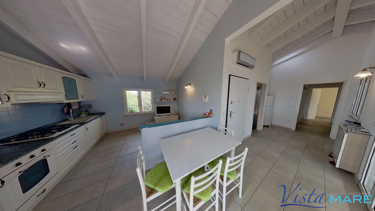 BELLARIA - A 50 metri dalla spiaggia, appartamento attico di recente costruzione con terrazzo loggiato abitabile vista mare. L'immobile fa parte di un piccolo contesto residenziale ed è composto da ingresso, soggiorno con cucina a vista, disimpegno, tre camere da letto e bagno. Servito da ascensore interno, presenta travi in legno a vista ed è dotato di riscaldamento a pavimento, aria condizionata e videocitofono. Completo di garage al piano terra, pavimentato e finestrato. Clicca qui per la visione interattiva. https://my.matterport.com/show/?m=rFQNfYvXFFT